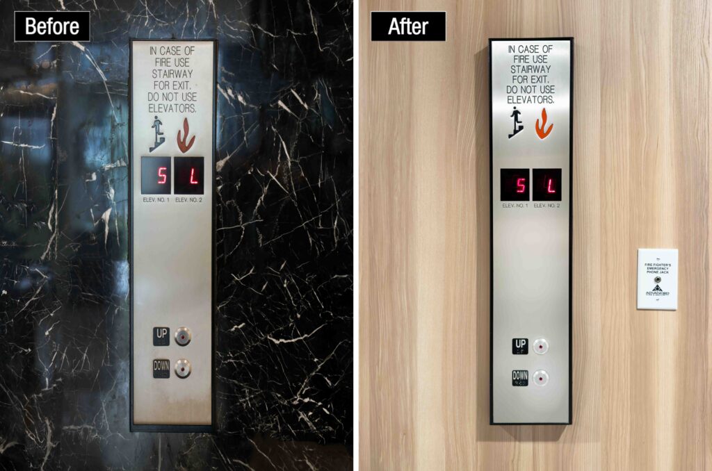 The building’s elevators and hallway wall surfaces play a critical role in first impressions for residents and guests. Over time, these high-touch areas can show signs of aging, scuffing, fading, and outdated design. Rather than pursuing costly demolition and replacement, Emerald Tower chose a smarter solution: architectural resurfacing.