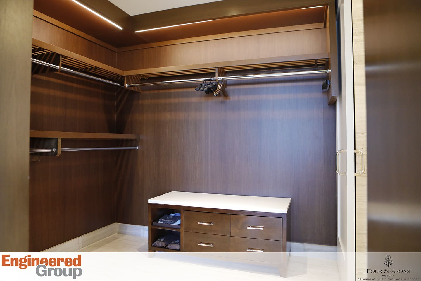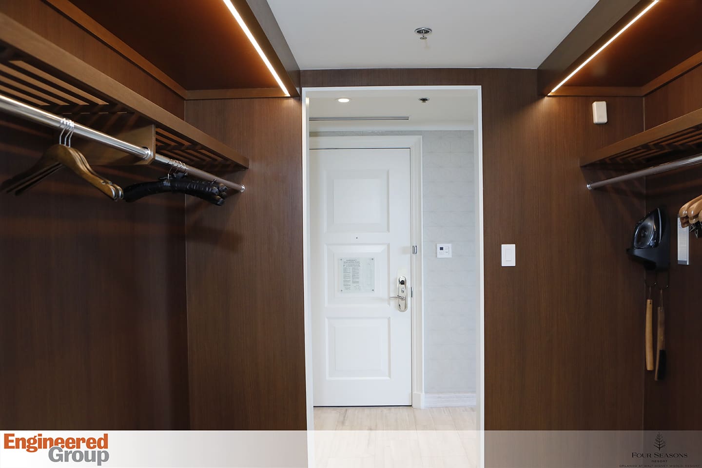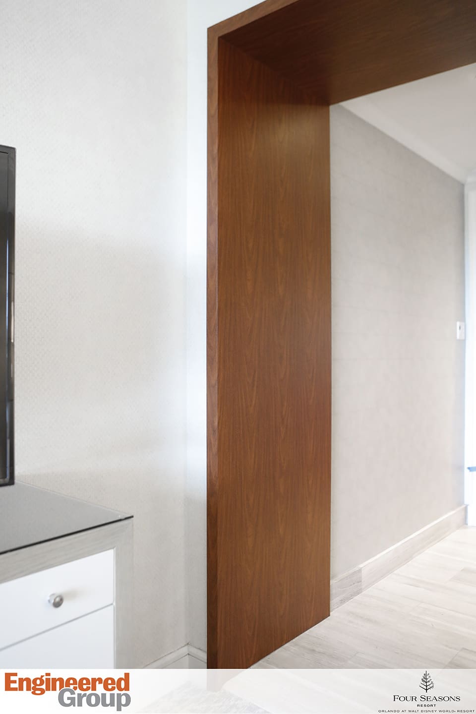 With help from Wimberly Interiors, Kevin Barry Fine Art, and the team at Engineered Group, the Four Seasons Resort Orlando at Walt Disney World® Resort has completely refreshed its guest rooms and suites. They additionally created the new look of a beautiful in-room wine bar by building a custom cabinet for the Plum machines and applying the Reatec RW-4095 film. The tall wood cabinet conceals the Plum machine and houses wine glasses and accessories, giving their guests a modern and magical experience. Using our architectural film Belbien SW-25, the resort transformed its suite entryways to give its guests a relaxing stay. They also utilized our Reatec architectural finishes RW-4095 and TC-5068 to transform the headboards, closets, event spaces, and minibars. Engineered Group’s architectural film allowed the Four Seasons Resort Orlando at Walt Disney World® Resort to transform their space into one that takes their guests to a whole new world.