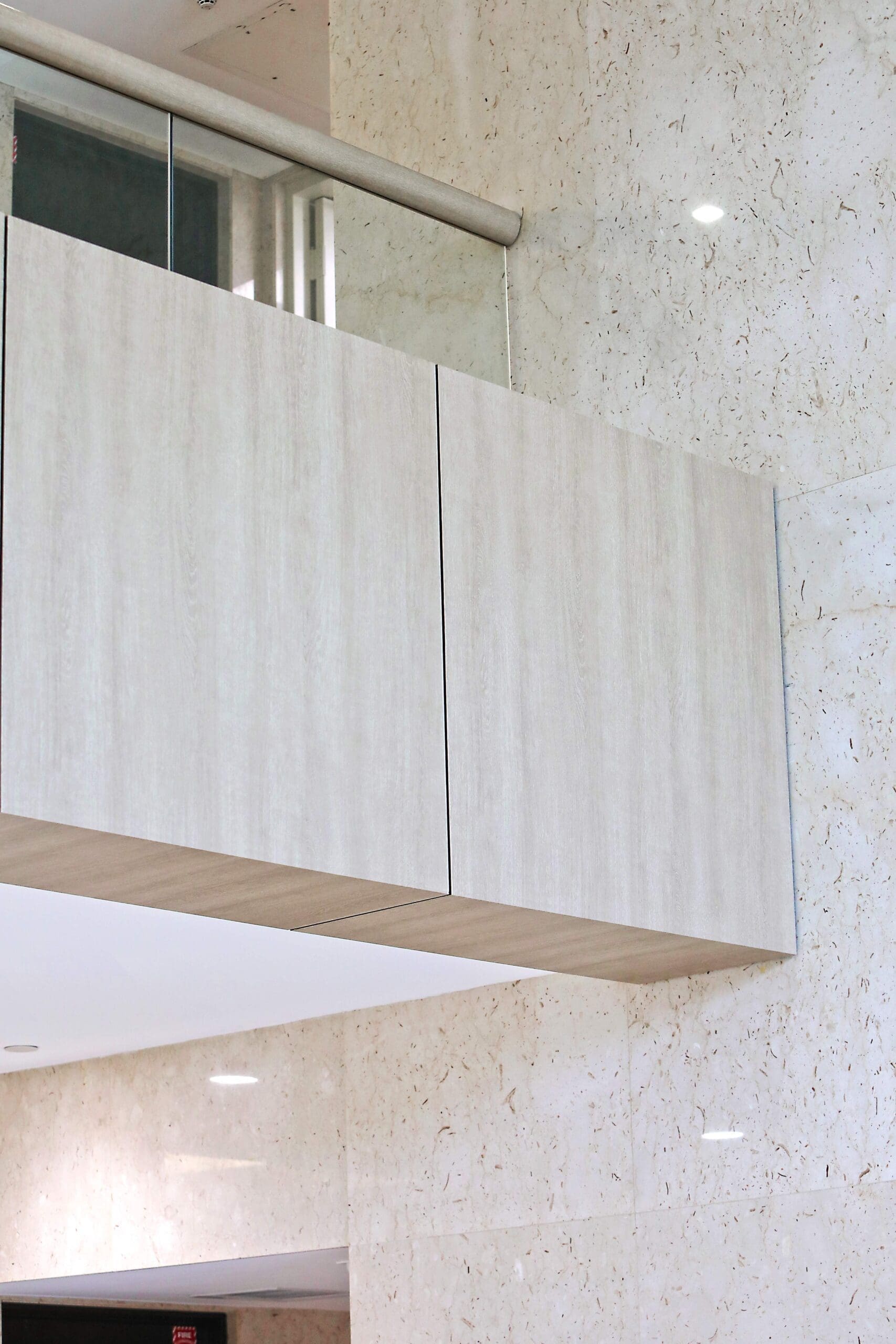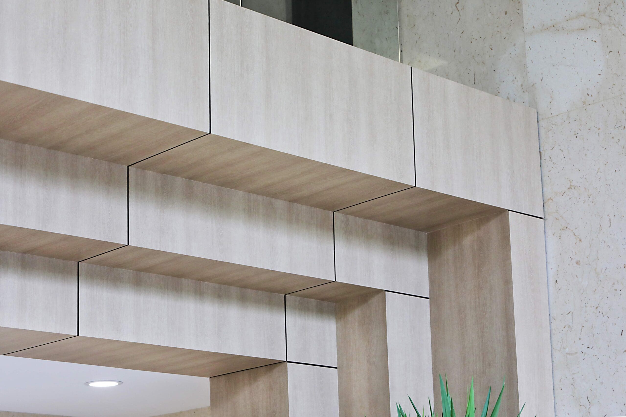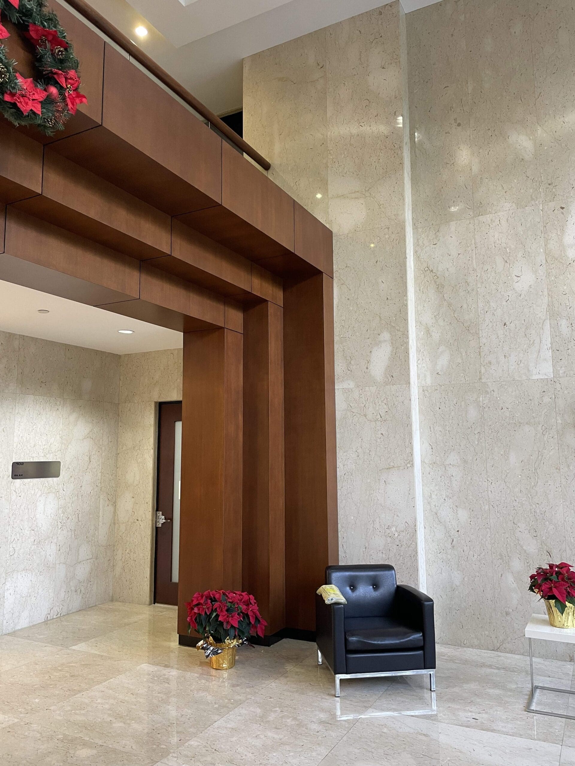 There are over 1000s of patterns and finishes to choose from in, including metal, wood, stone, and leather. For this project, the builder was looking for a wood grain to create a classic, clean, and modern look. We used Reatec BC-5458 to create the wood grain look on multiple features in the lobby, including the walls, entryways, and railings.