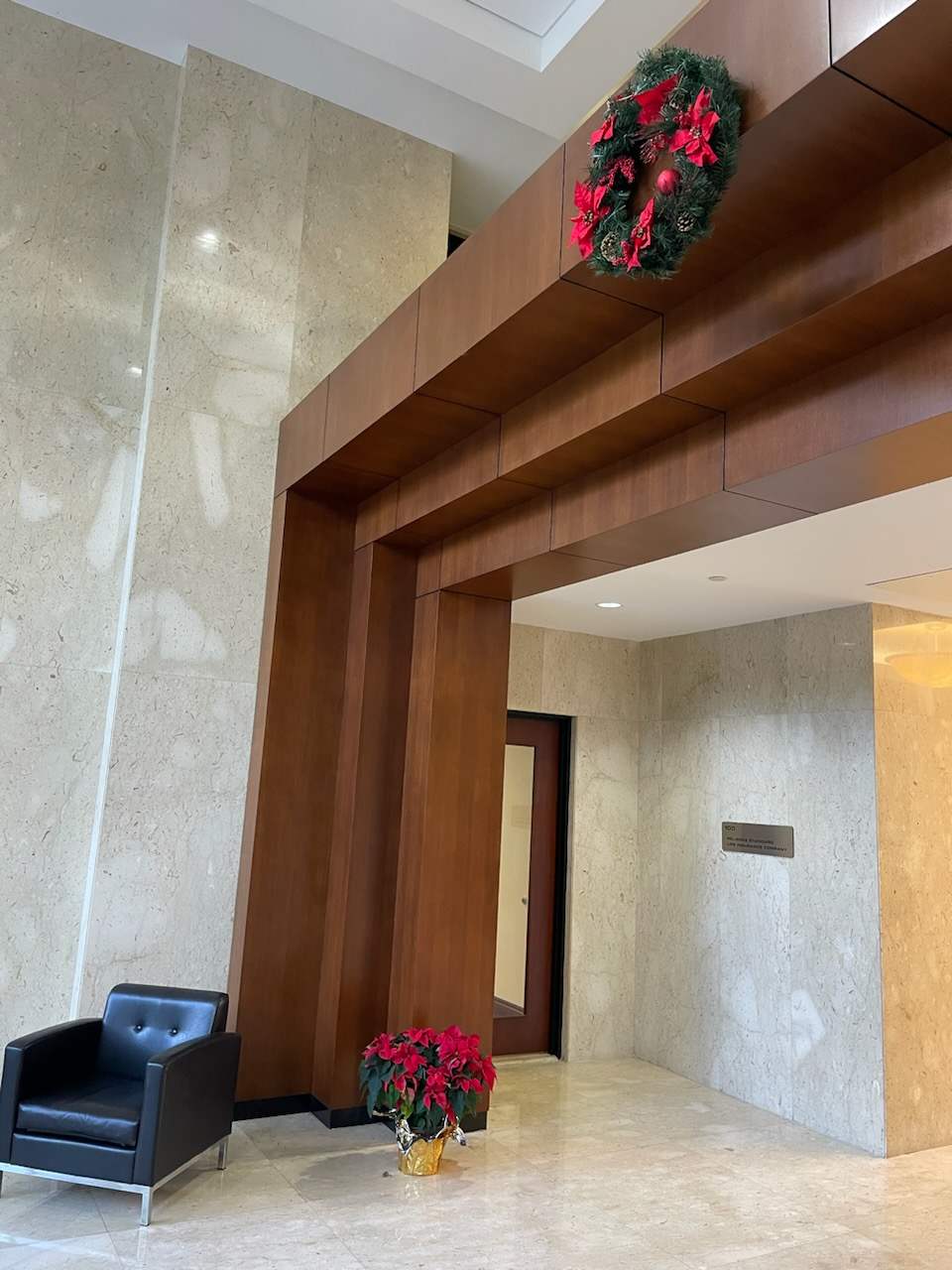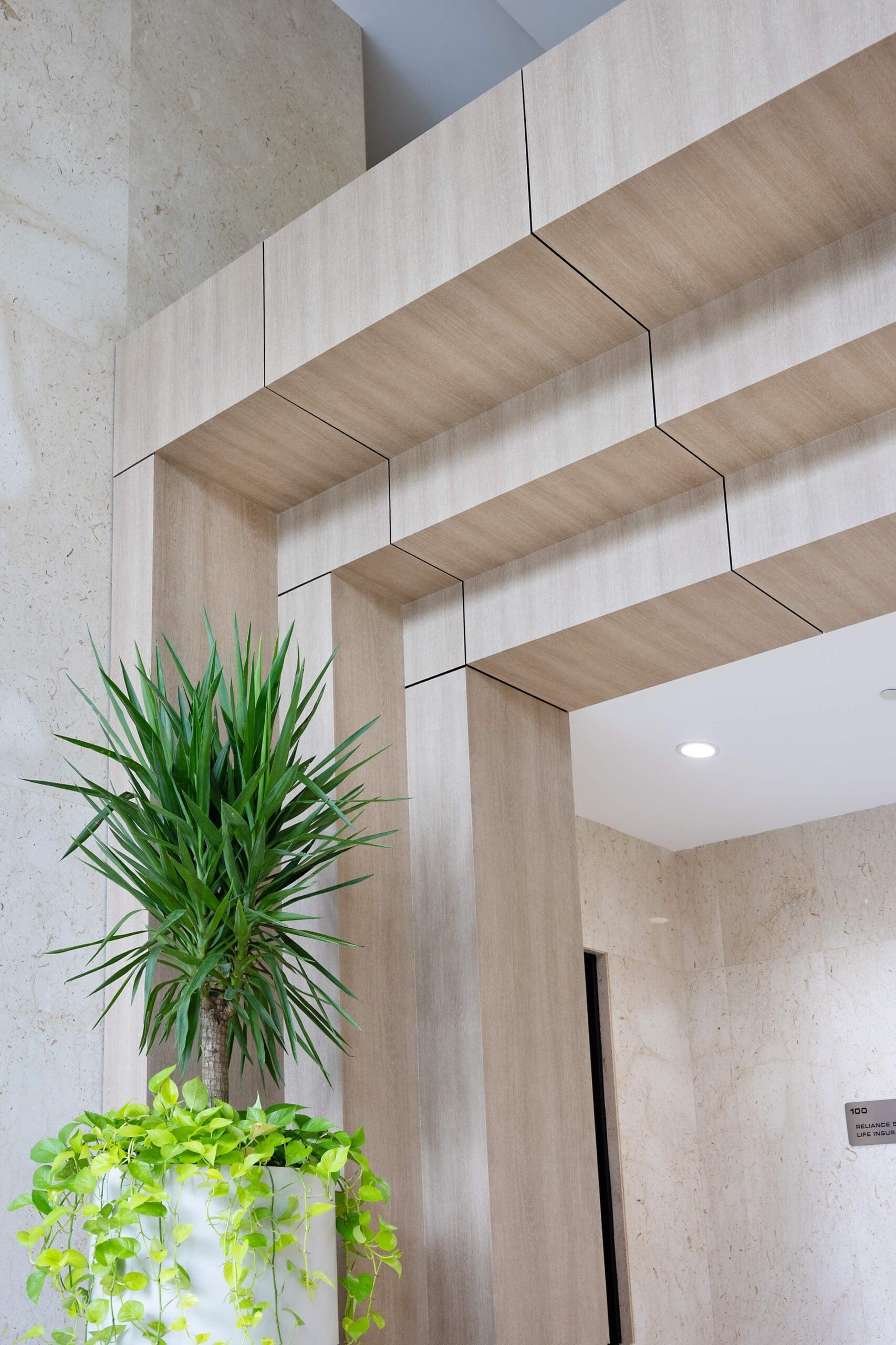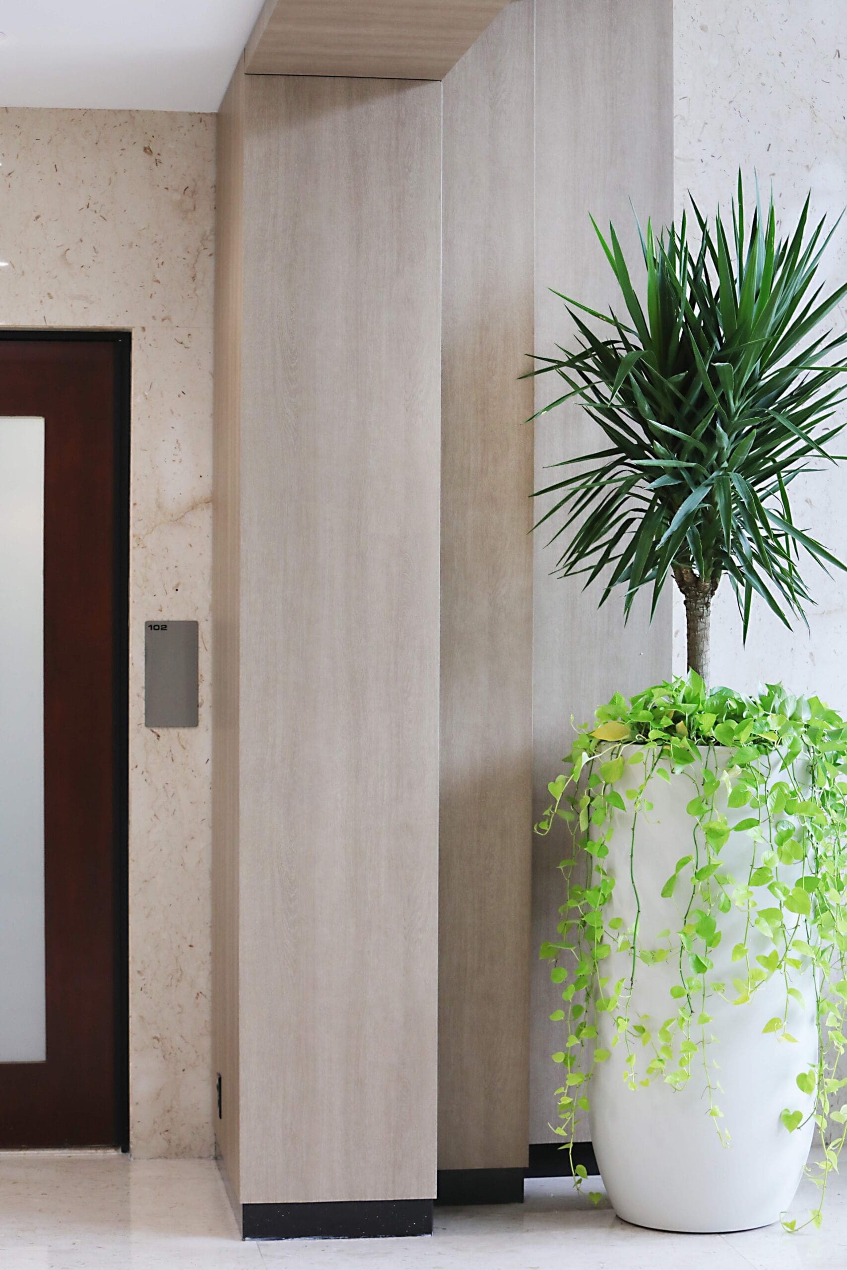There are over 1000s of patterns and finishes to choose from in, including metal, wood, stone, and leather. For this project, the builder was looking for a wood grain to create a classic, clean, and modern look. We used Reatec BC-5458 to create the wood grain look on multiple features in the lobby, including the walls, entryways, and railings.