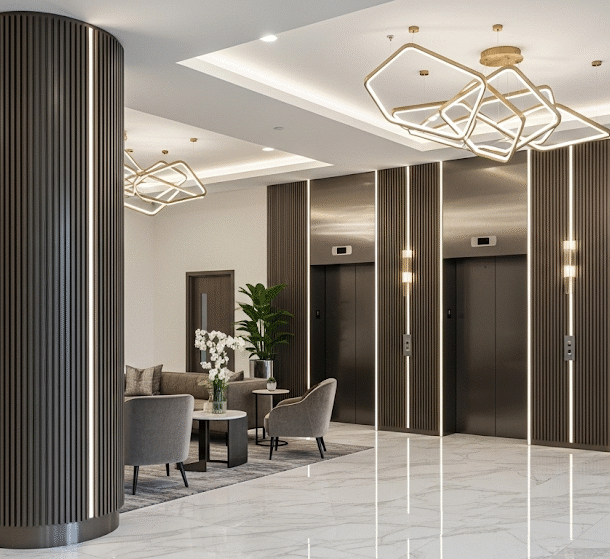 Hotels near urban centers or busy roads face persistent noise intrusion, which degrades the guest experience. Contractors mitigate this by installing acoustic drywall assemblies or fabric-wrapped panels that absorb mid- to high-frequency sound. In corridors and pre-function spaces, decorative baffles and wood slat screens not only meet fire and building code requirements but also contribute to warm, layered interiors that guests equate with luxury. Such interventions often deliver an ROI payoff in the form of higher guest satisfaction index (GSI) scores and five-star ratings on OTA platforms.